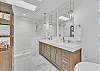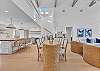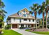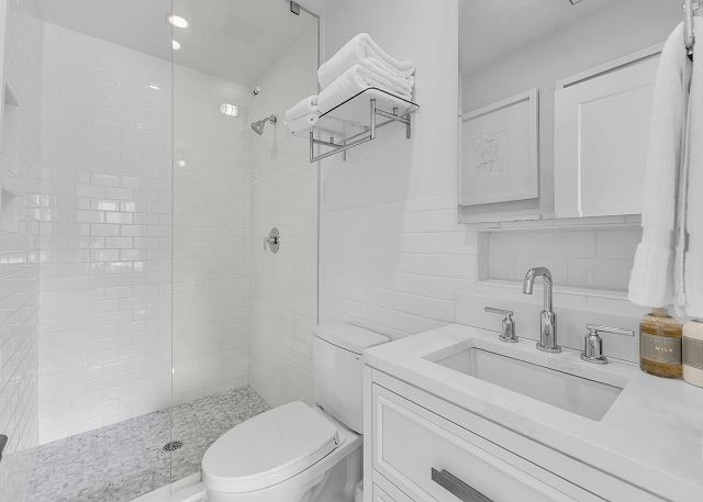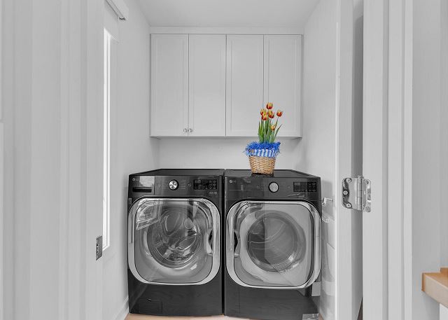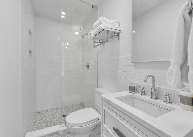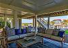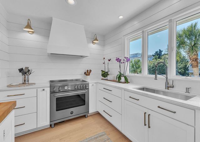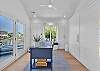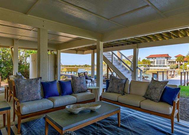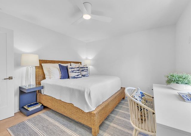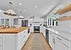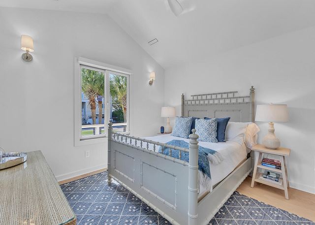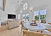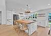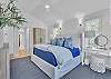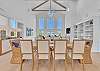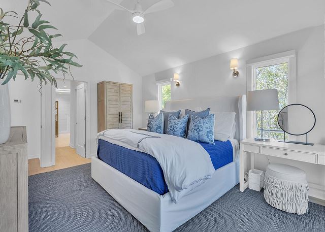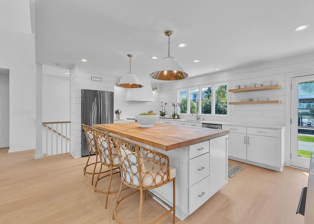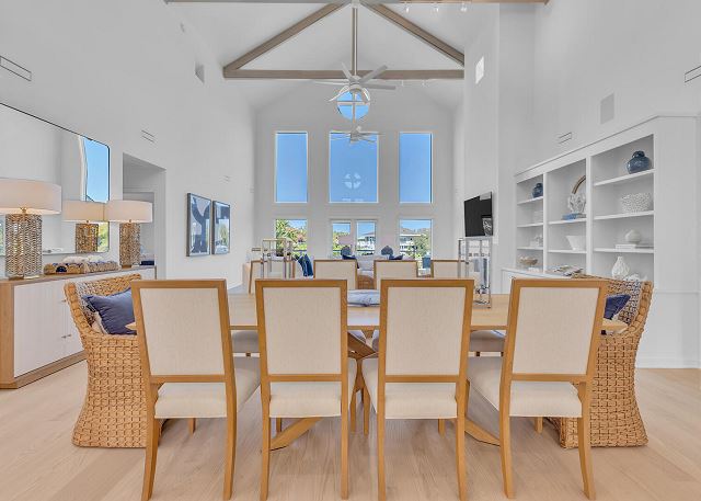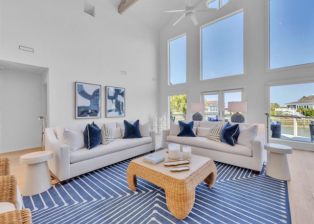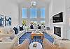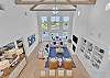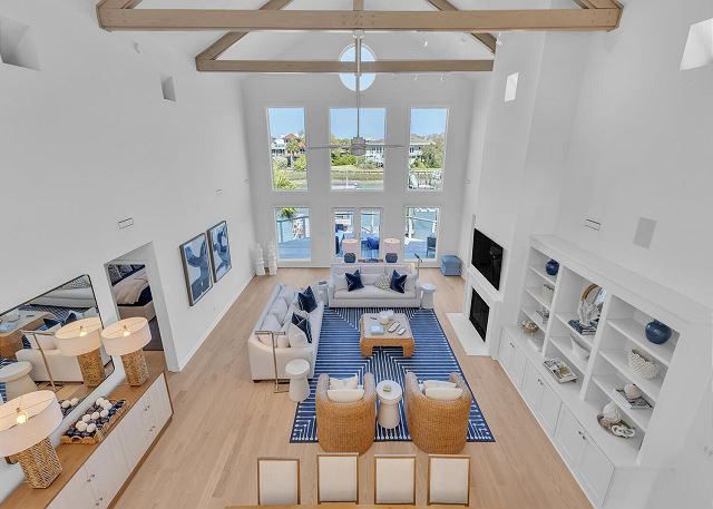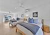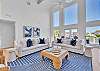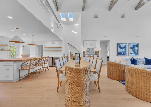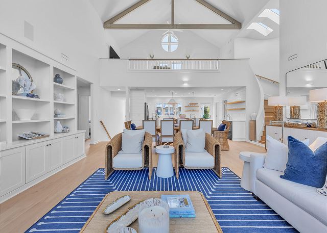 The main living area is located on the second floor and is open and airy, with vaulted ceilings. With tons of natural light, you can’t help but relax among the blue, white and natural tones. With 2 large, comfy couches, a fireplace plus additional seating, there is room for everyone. A very large dining table seats 10, plus the kitchen island has stools. The kitchen is lovely with a huge island for multiple cooks.