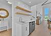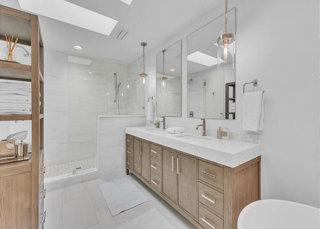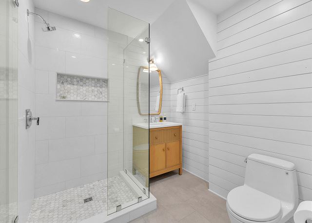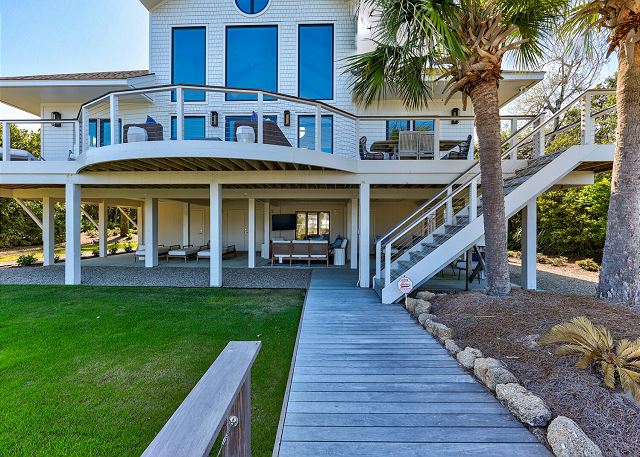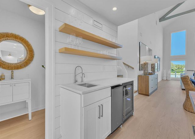 This floor has a beautiful master suite with a king bed and spacious private bath. Additionally, there is a home office space with a Murphy bed that looks out over the water. You will also find 2 additional bedrooms, 1 king and 1 queen, each with a private bathroom. Finally, this floor also has a laundry room, a butler’s pantry and a powder room.