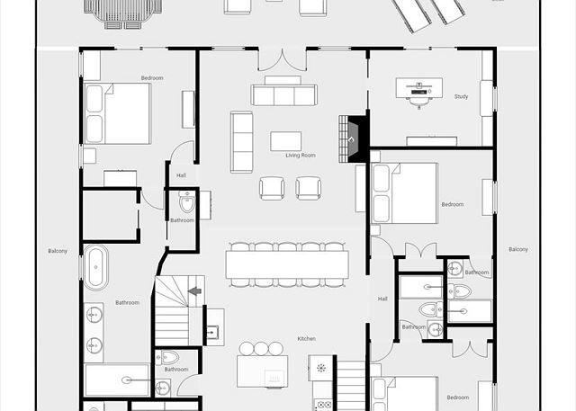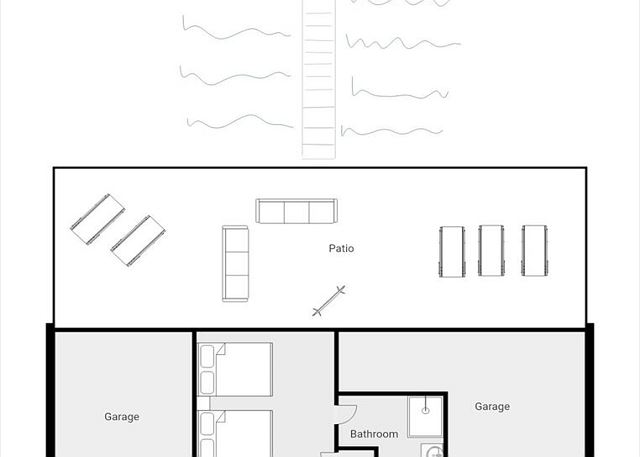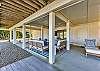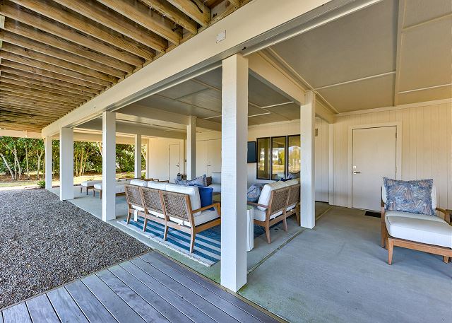 The ground floor has a large bedroom with two queen beds, a sitting area and a private bathroom. Out back is a very spacious outdoor living area that has multiple arrangements and is fully covered. There are also two garages.