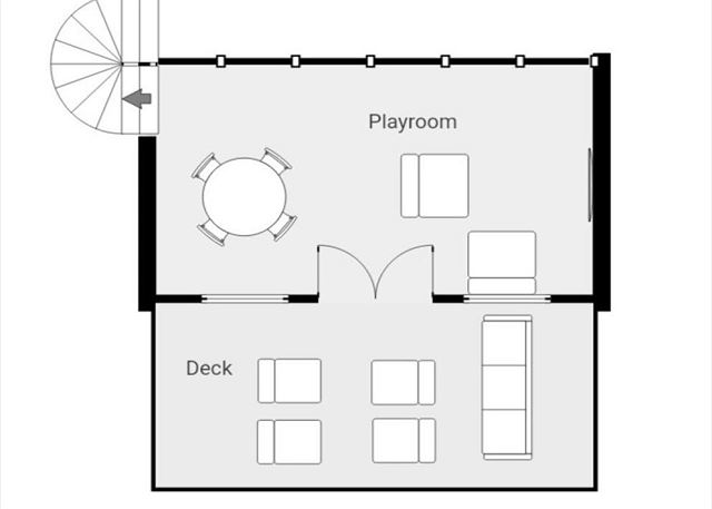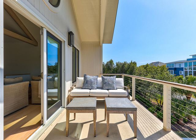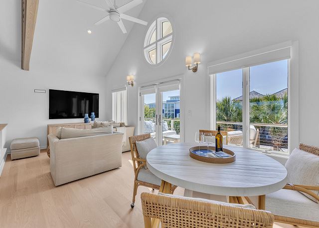 The third floor is a large, lofted family room that overlooks the main living area. It has comfy seating, a large tv and a table for playing games. Through the glass doors is another deck where you can soak up the sun and enjoy gorgeous sunsets.